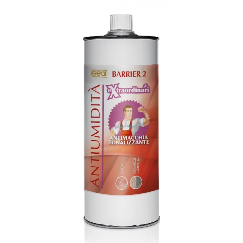 BARRIER 2 (Geal) è un protettivo idro-oleorepellente di profondità per interni ed esterni. Evita la formazione di efflorescenze, muffe, macchie di umidità; riduce l'assorbimento di sostanze oleose, cause di macchie ed aloni persistenti. Non crea film e non altera sostanzialmente la traspirabilità del materiale . Conferisce leggera tonalizzazione al colore originario. BARRIER 2 (Geal) non ha funzione impermealizzante assoluta, quindi non deve essere utilizzato su materiali a diretto contatto con acqua in pressione come ad esempio nelle strutture di contenimento d'acqua come piscine, vasche, serbatoi etc.