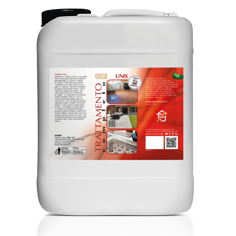 Unix (Geal) è un preparato innovativo polifunzionale che permette di effettuare il trattamento completo utilizzando un unico prodotto; di facile e rapida applicazione e con elevate caratteristiche prestazionali. Rappresenta il prodotto ideale in tutte quelle situazioni in cui non sia possibile utilizzare i consueti cicli di adattamento che prevedono l'applicazione di più prodotti con funzionalità differenziate. Conferisce elevata resistenza alle macchie più comuni, in particolare macchie di natura grassa (oli e grassi vegetali e animali), macchie di natura acida (limone, aceto, Coca Cola), macchie di natura alcolica (vino, pennarelli, inchiostri). Non adatto al trattamento di marmi, graniti lucidati. Unix (Geal) conferisce elevata resistenza antiusura e protezione antimacchia, ottima trasparenza ed elasticità, ridotta scivolosità e facile ripristinabilità. Rende l'aspetto finito, naturale e con lucentezza satinata. Su materiali caratterizzati da elevato rischio di umidità di risalita si consiglia di rimuovere eventuali fonti e di applicare Unix (Geal) dopo adeguata protezione con idrorepellenti di profondità (Icr 17 - Super Idroblock - Geal), livellanti di assorbimento (Graniglie Prof - Geal) o consolidanti (Pulvistop, Base -Geal). In questo caso è bene attendere 48-72 ore prima dell'applicazione di Unix (Geal).